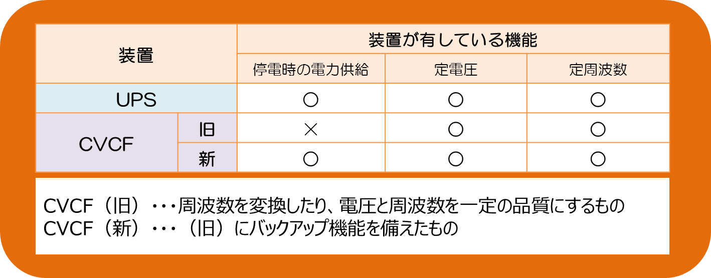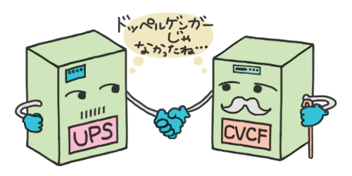 装置名称だけをみると、UPS「無停電電源装置」とCVCF「定電圧定周波数装置」では、装置の機能に差があるように思えますね。