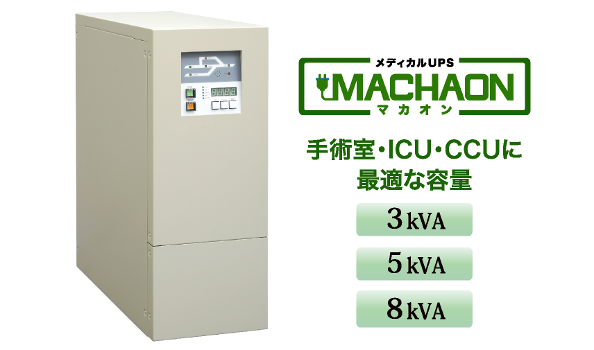 『MACHAON(マカオン)』は「3kVA」「5kVA」「8kVA」の3つの容量があり、手術室やICU・CCUに設置するのに最適な容量です。手術中に停電なんて、絶対にあってはならないことですものね…。