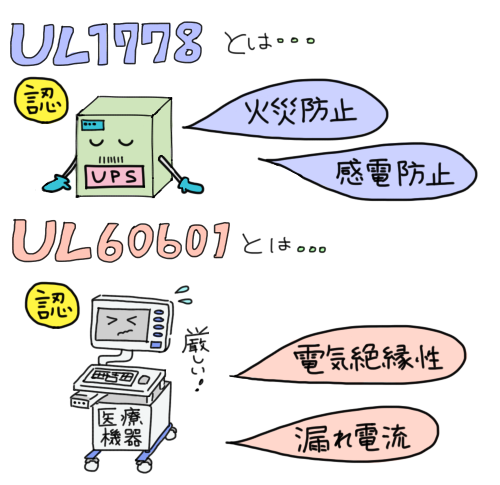 「UL1778」は無停電電源装置(UPS)を対象として火災防止や感電防止などに重点が置かれた規格ですが、「UL60601-1」は医療機器を対象としており、電気絶縁性や漏れ電流など非常に厳しい制限が設けられているものです。